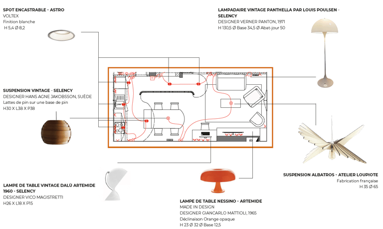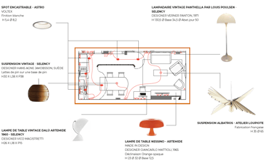 Pour aménager l’espace, le mobilier de réemploi a été favorisé lorsque cela était possible : fauteuil Togo, table basse, bureau et luminaires ont été sélectionnés d’occasion (réemploi ex-situ).