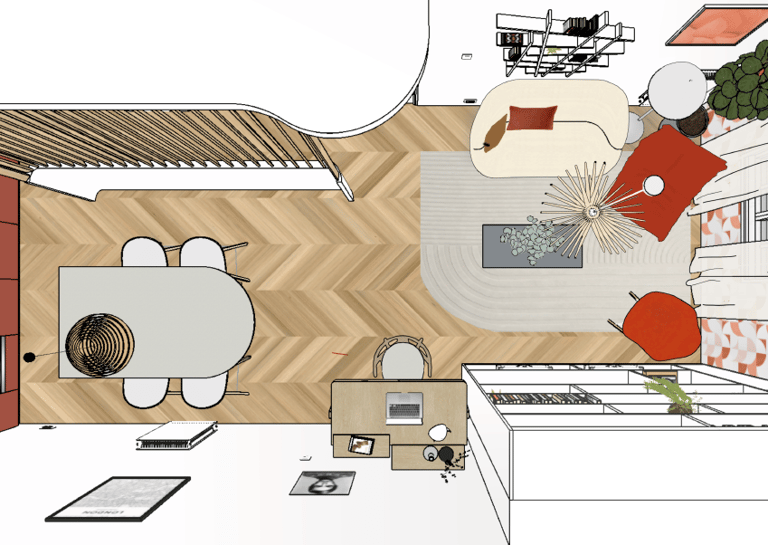 Ré-agencement de l’espace pour créer deux coins distincts mais non coupés visuellement.