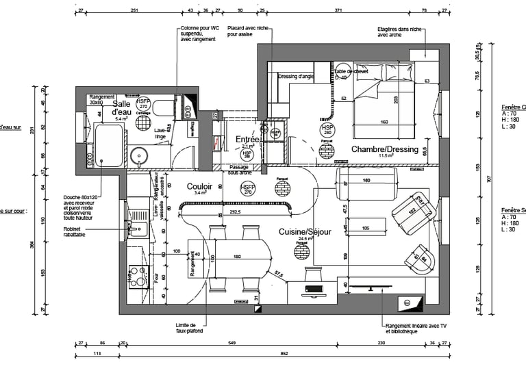 - un séjour comprenant notamment un meuble sur mesure avec bibliothèque / bureau intégré / TV.
