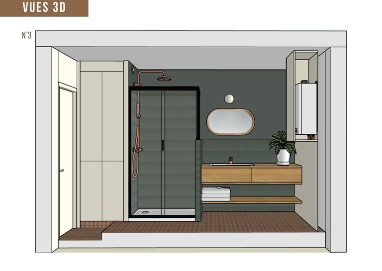 Ensuite, après avoir échangé avec eux à propos de leurs goûts et de leurs envies, je leur ai proposé une planche d'ambiance et un aménagement permettant de gagner en fonctionnalité. Je leur ai également proposé des modélisations 3D pour les aider à se projeter, ainsi que des matériaux, du mobilier et des accessoires en adéquation avec la planche d'ambiance.