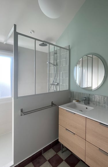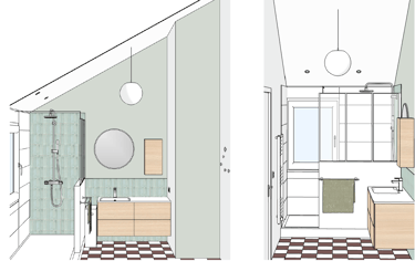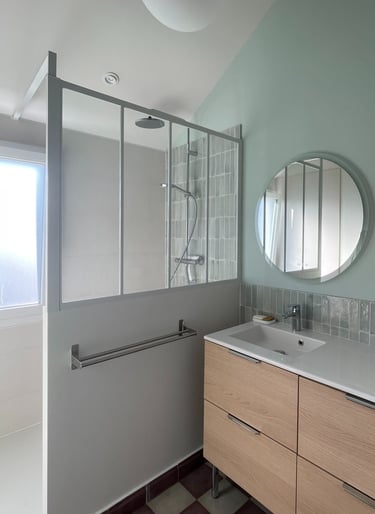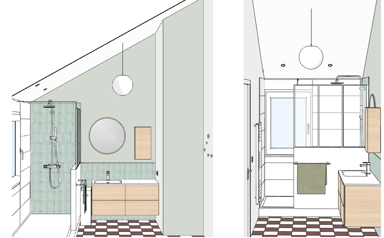 • Pour la salle d’eau, une atmosphère claire et facile à entretenir, avec des rangements bien structurés pour un usage quotidien pratique.