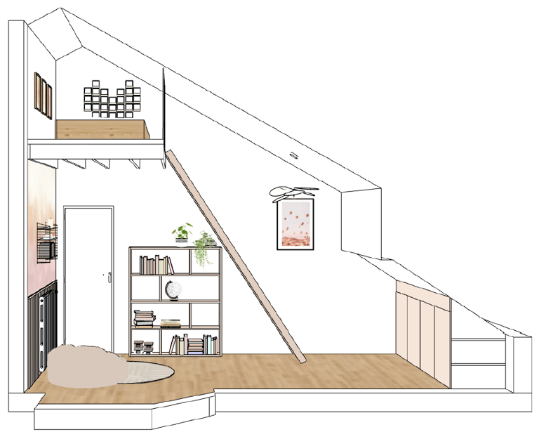 Proposition de planches d’ambiance et de modélisations 3D pour accompagner la réflexion sur les couleurs, les matières et le mobilier.