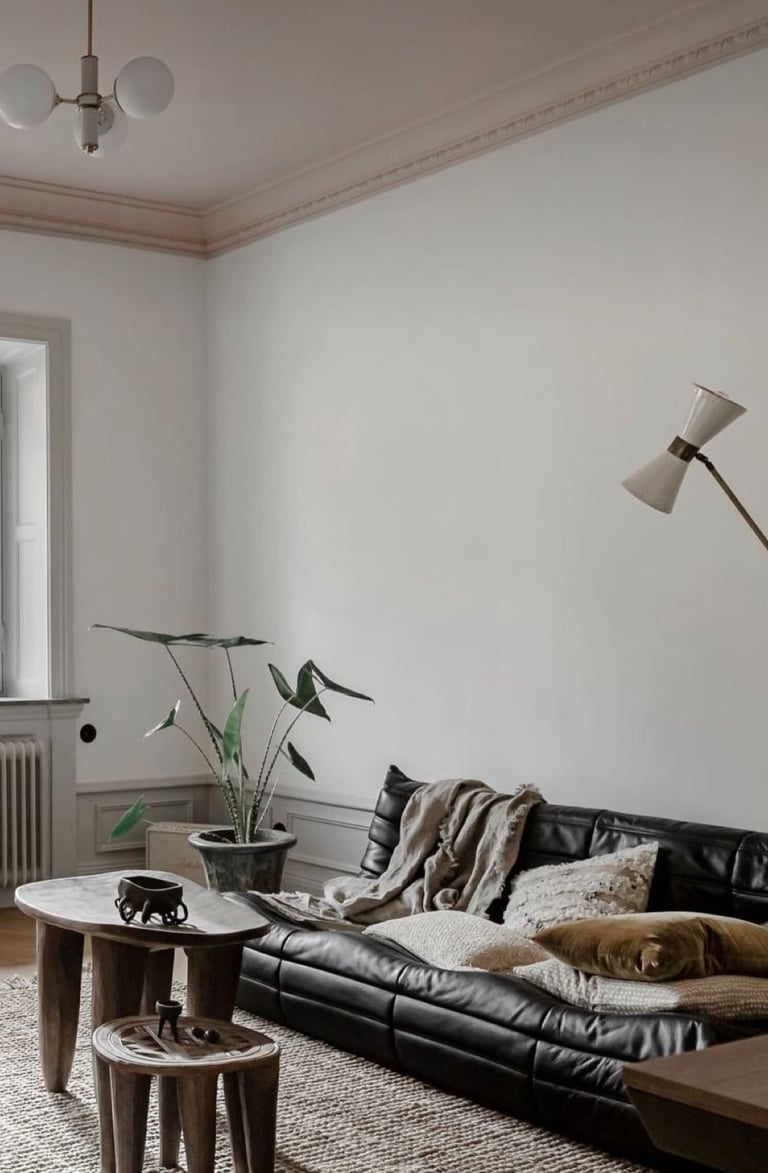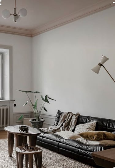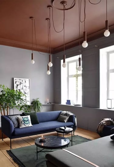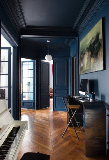 Plafonds hauts (3m et plus) : Vous pouvez opter pour une couleur foncée pour « abaisser » visuellement le plafond, apportant une atmosphère chaleureuse et cocooning, idéale dans les grands espaces.