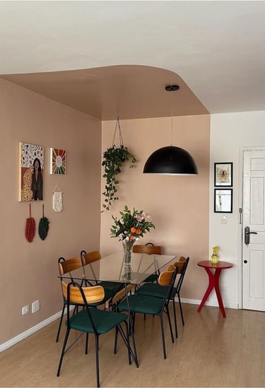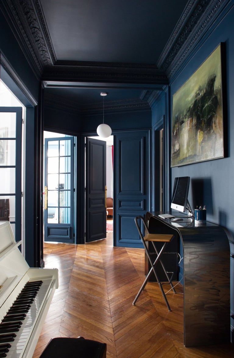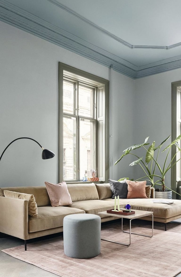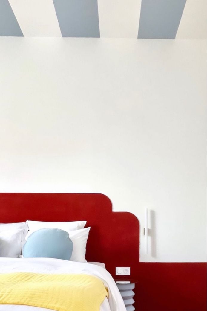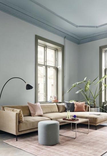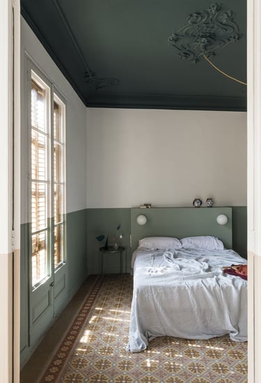 Plafonds colorés et bicolores : Peindre des formes, les moulures ou les corniches dans une couleur différente peut donner un effet graphique et élégant, parfait pour un intérieur contemporain.