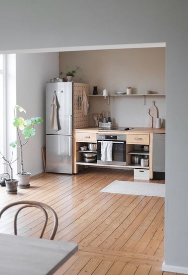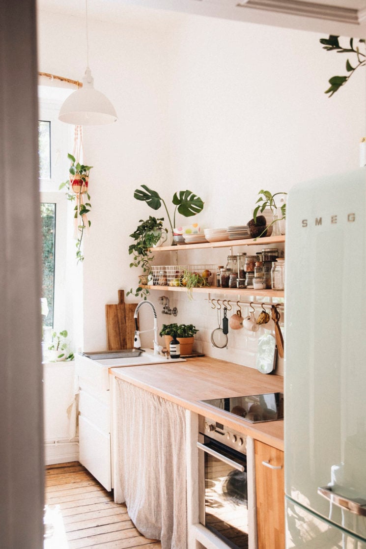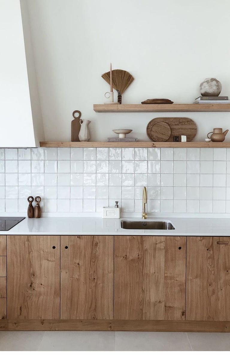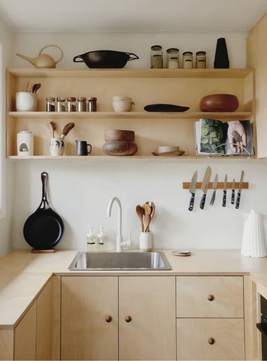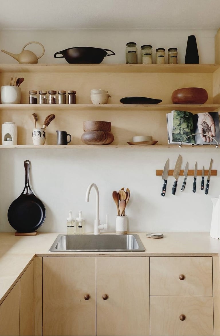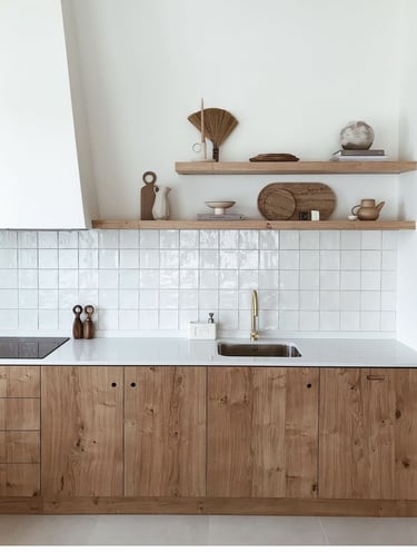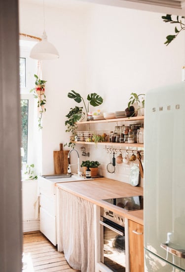 La première piste pour une cuisine plus éco-responsable consiste à limiter la matière. Cela implique de réduire l'utilisation de portes et placards lorsque c'est possible. Une option élégante est d'opter pour des rideaux à la place des portes, ajoutant une touche de style campagne chic. Pour les esprits minimalistes, ne pas utiliser de portes du tout et laisser les étagères apparentes offre une alternative épurée, idéale pour le style industriel ou campagne chic.