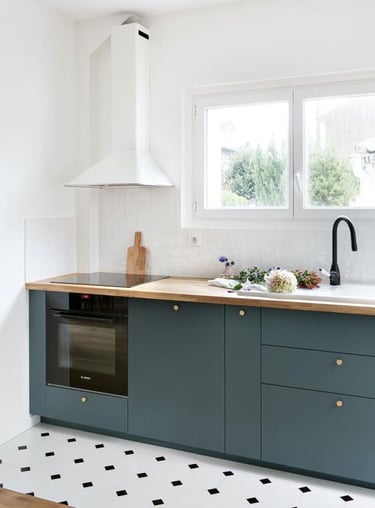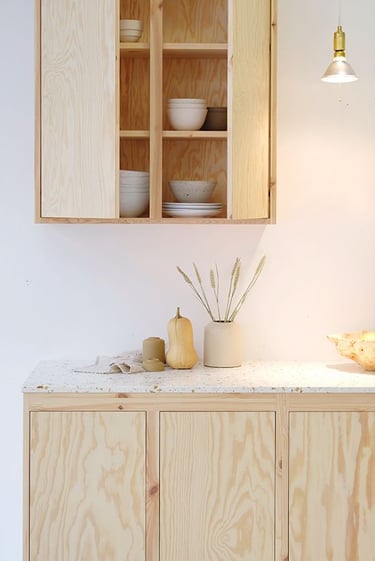 Enfin, la troisième piste nous amène vers le réemploi. Les caissons en aggloméré, bien que moins idéaux en termes d'émissions de COV, peuvent être une option viable s'ils sont anciens. L'avantage réside dans le fait qu'ils n'émettent plus de substances nocives, et aucune nouvelle matière n'est utilisée. Complétez-les éventuellement avec des portes neuves provenant de marques spécialisées dans le réemploi telles que Plum Living, Bocklip, ou Reform. Cette approche permet de créer une cuisine unique et respectueuse de l'environnement.